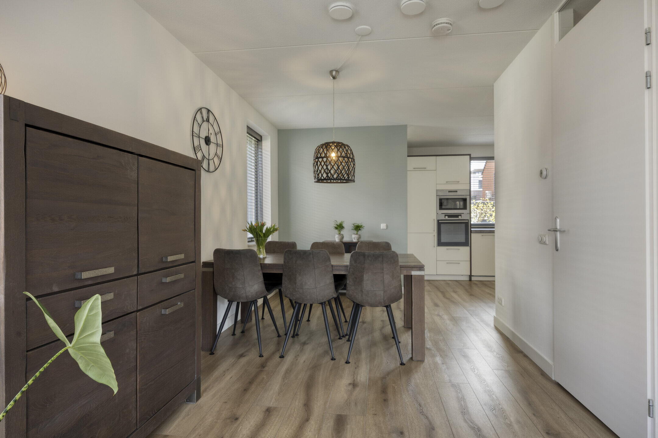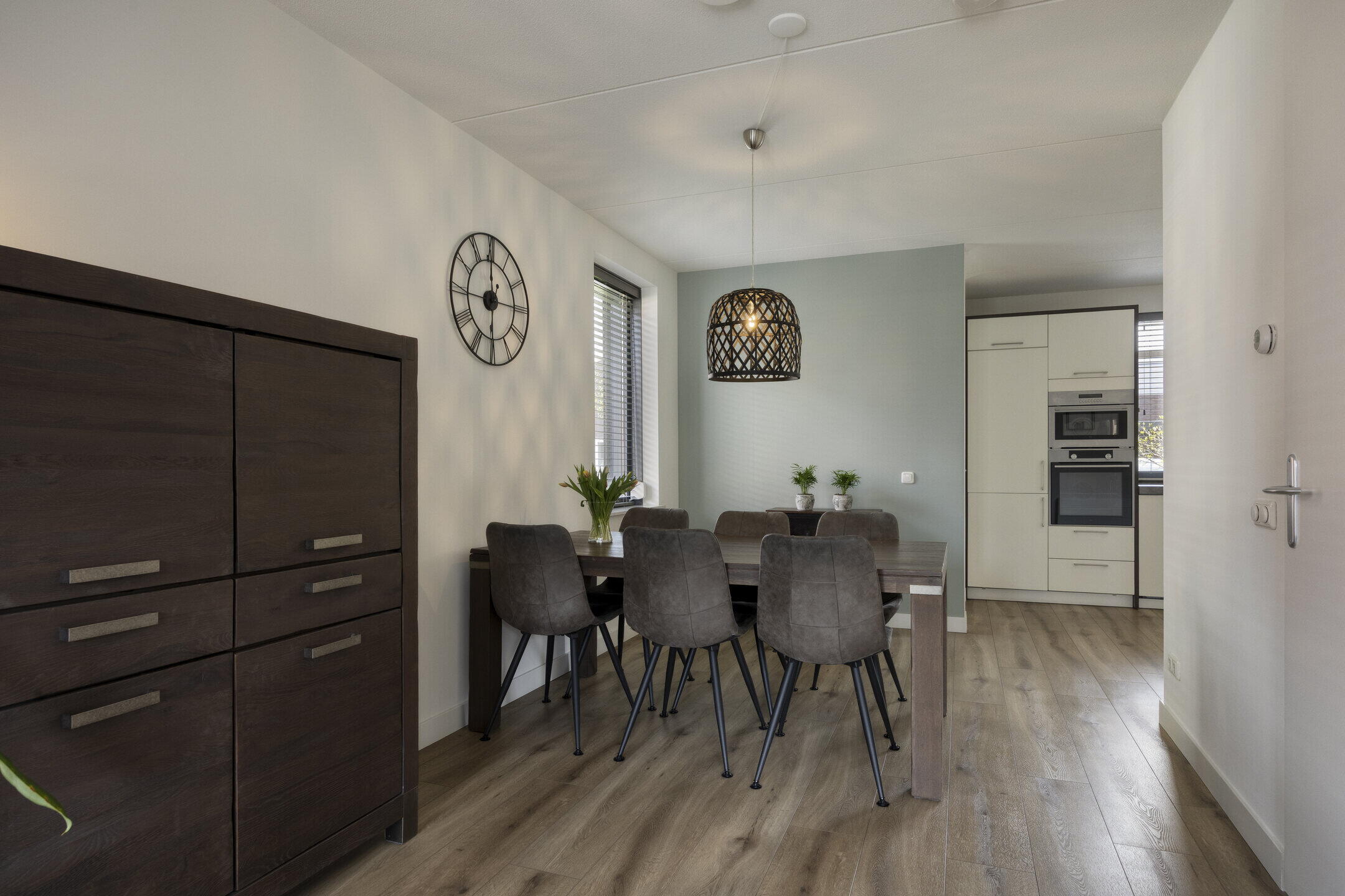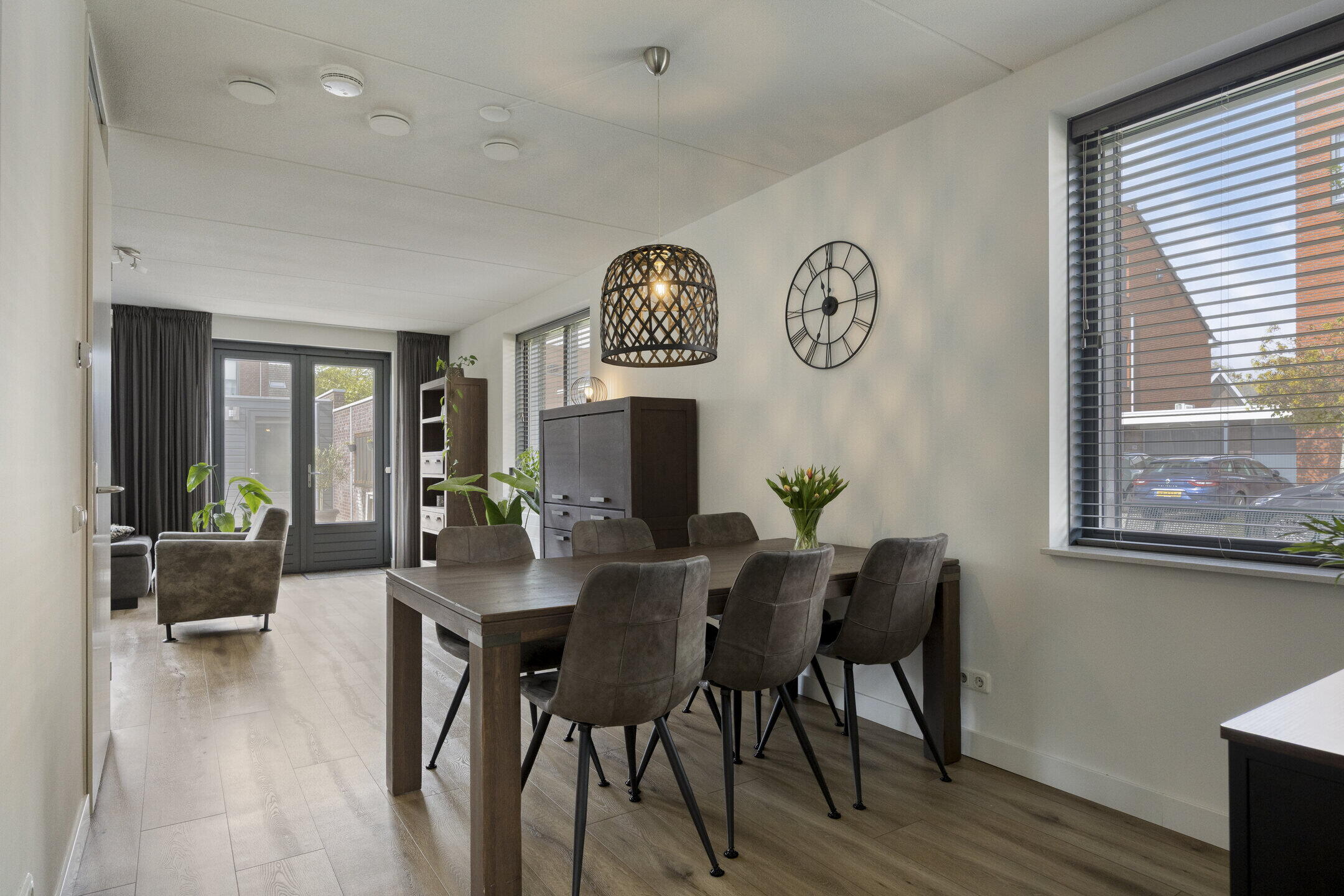 De woonkamer aan de achterzijde is heerlijk licht dankzij de grote raampartijen en openslaande deuren naar de tuin. Hier geniet je van een fijne verbinding tussen binnen en buiten. De nieuwe vloer draagt bij aan de moderne en sfeervolle uitstraling.