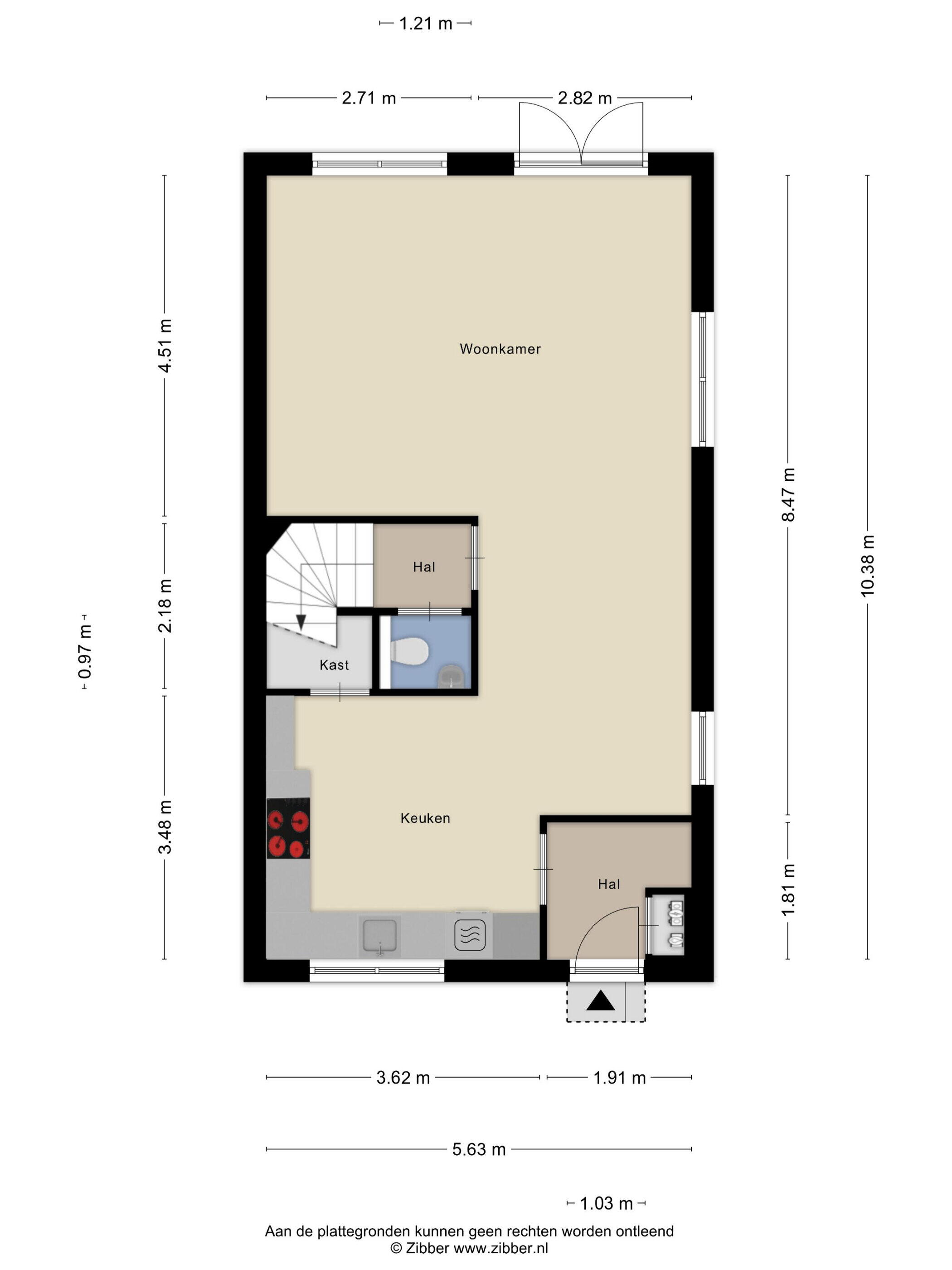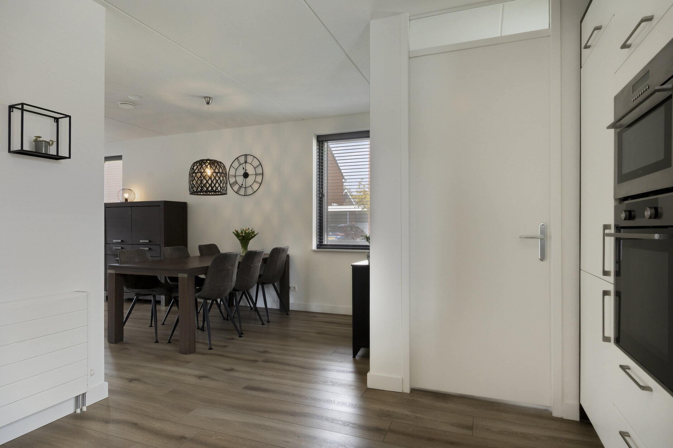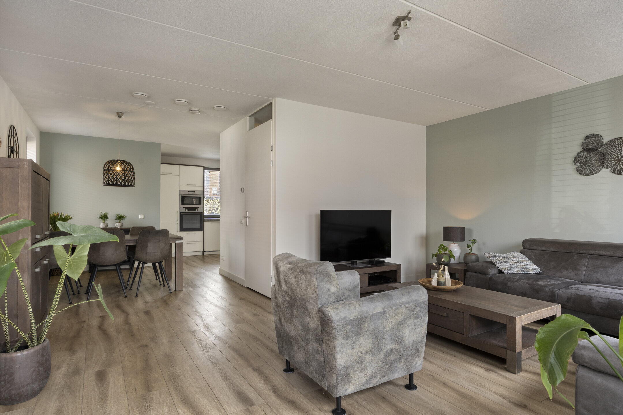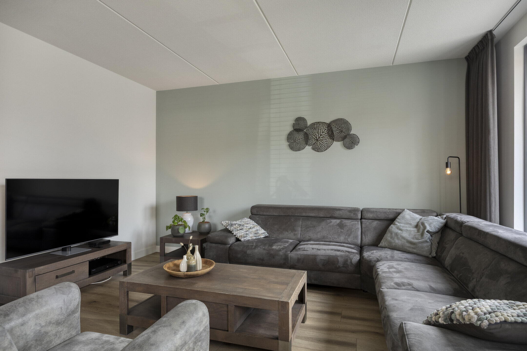 De woonkamer aan de achterzijde is heerlijk licht dankzij de grote raampartijen en openslaande deuren naar de tuin. Hier geniet je van een fijne verbinding tussen binnen en buiten. De nieuwe vloer draagt bij aan de moderne en sfeervolle uitstraling.