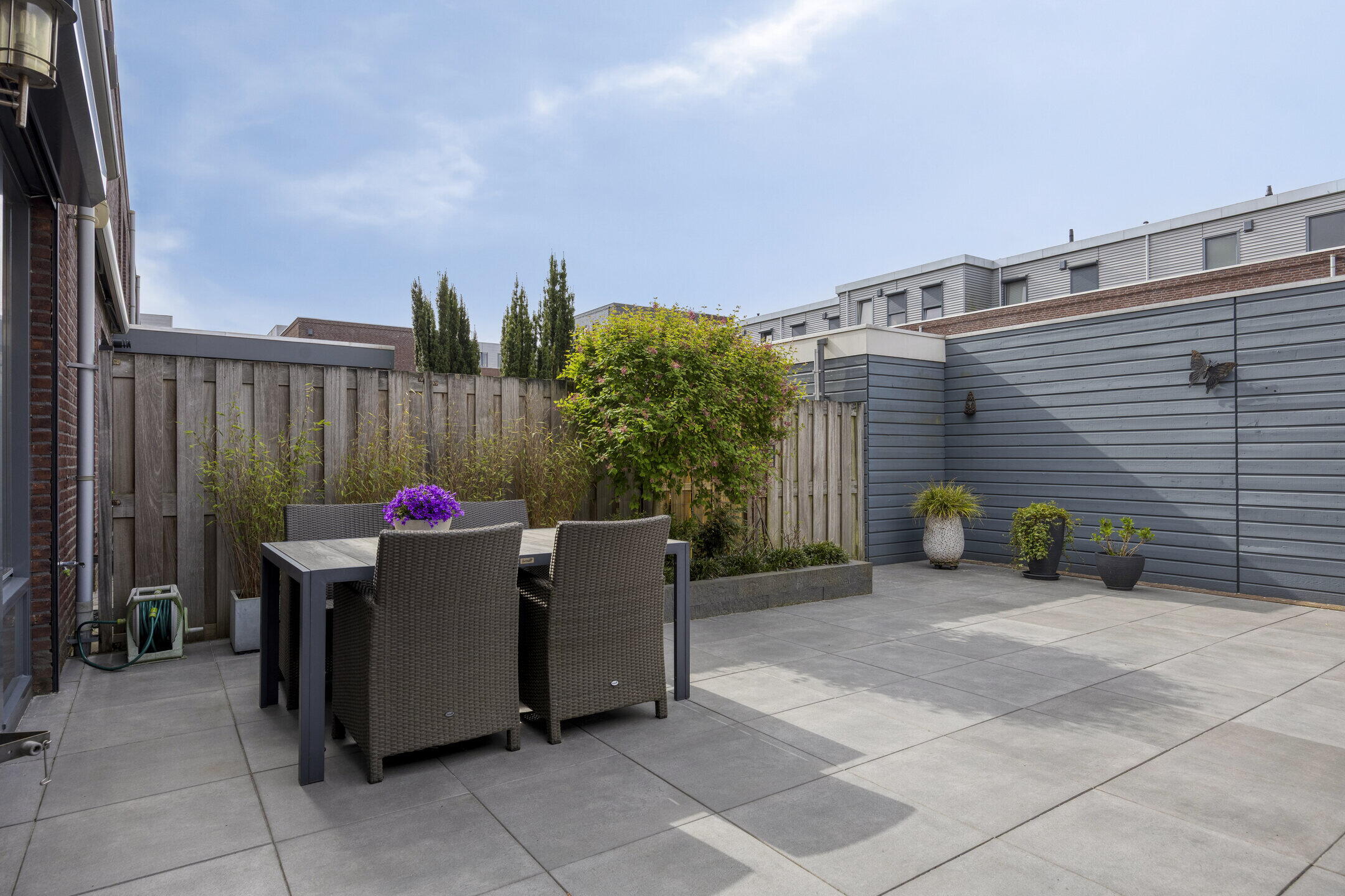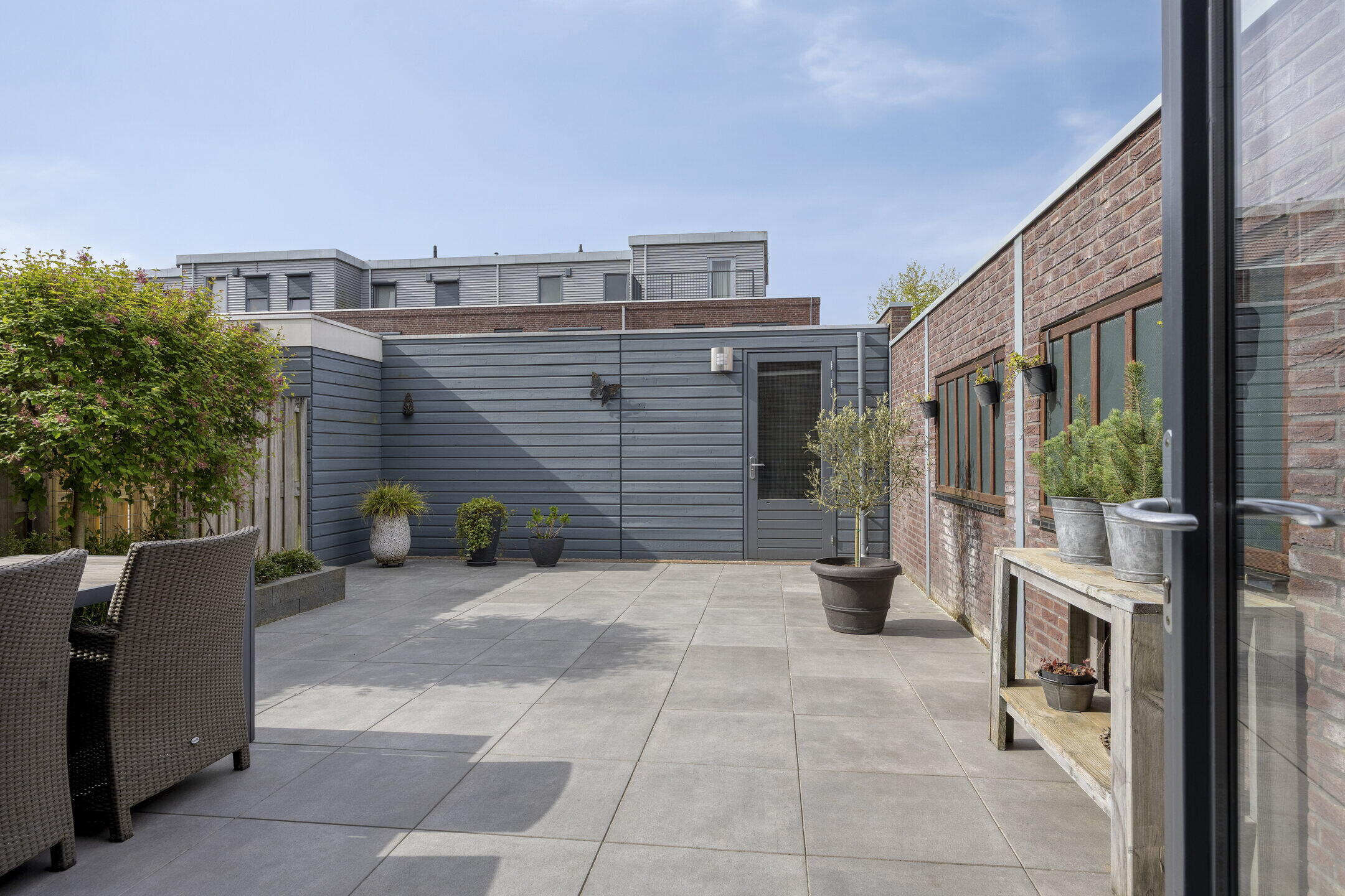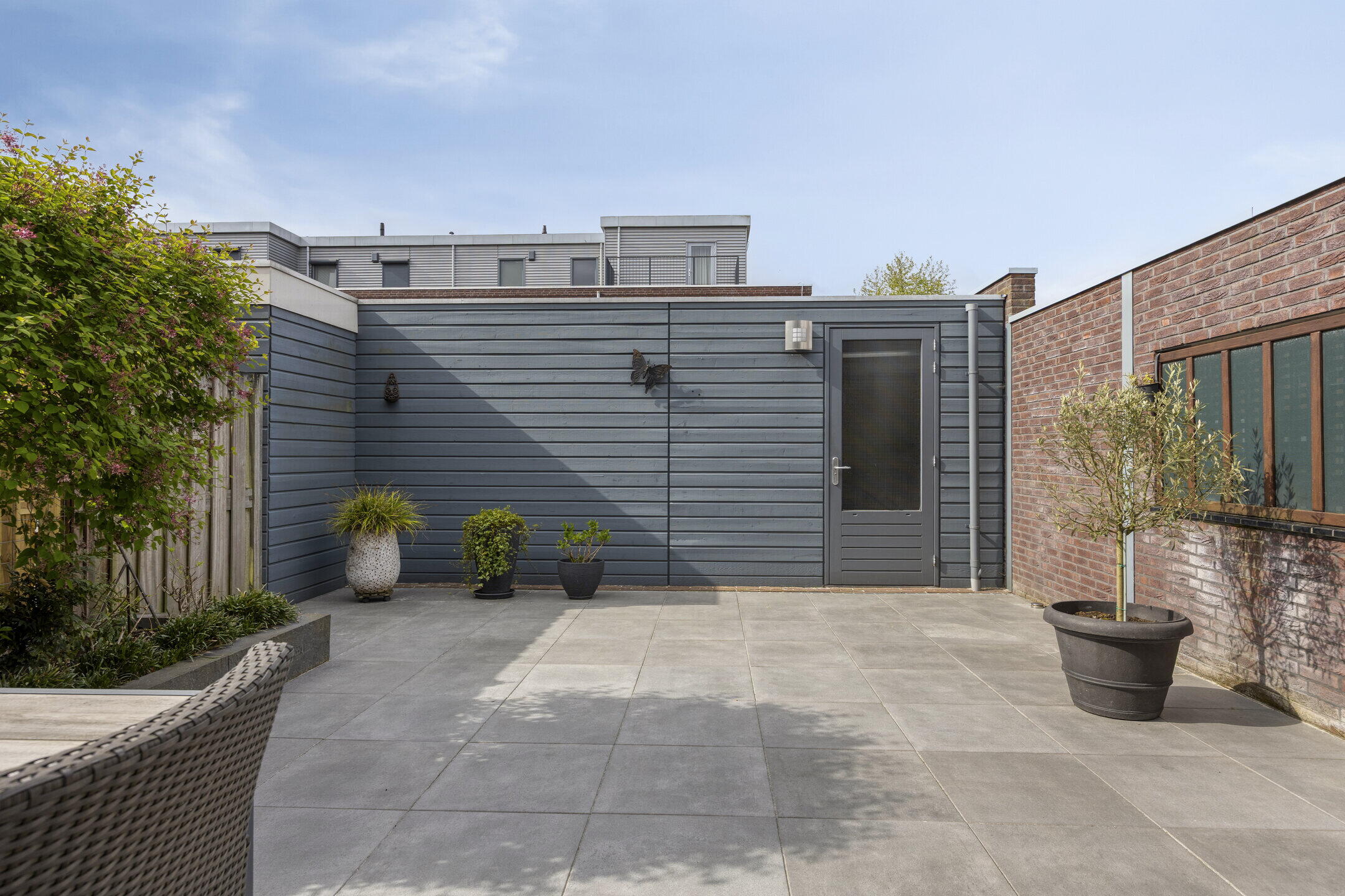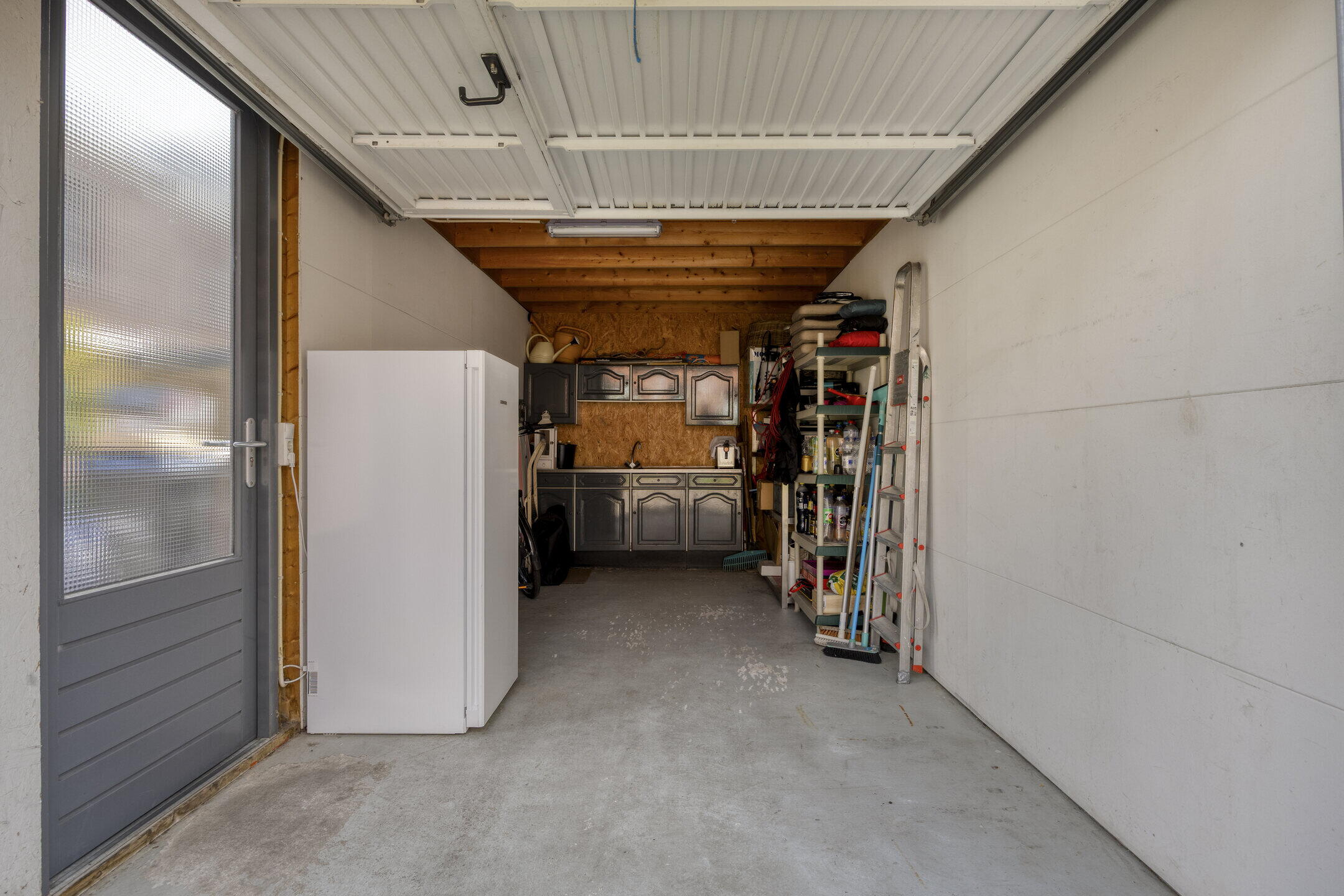De zonnige achtertuin op het zuidwesten is onderhoudsvriendelijk aangelegd en voorzien van een elektrisch zonnescherm over de volledige breedte. Via de tuin bereik je de vrijstaande, geïsoleerde garage met keukenblok en loopdeur — ideaal voor hobby, werk of opslag.