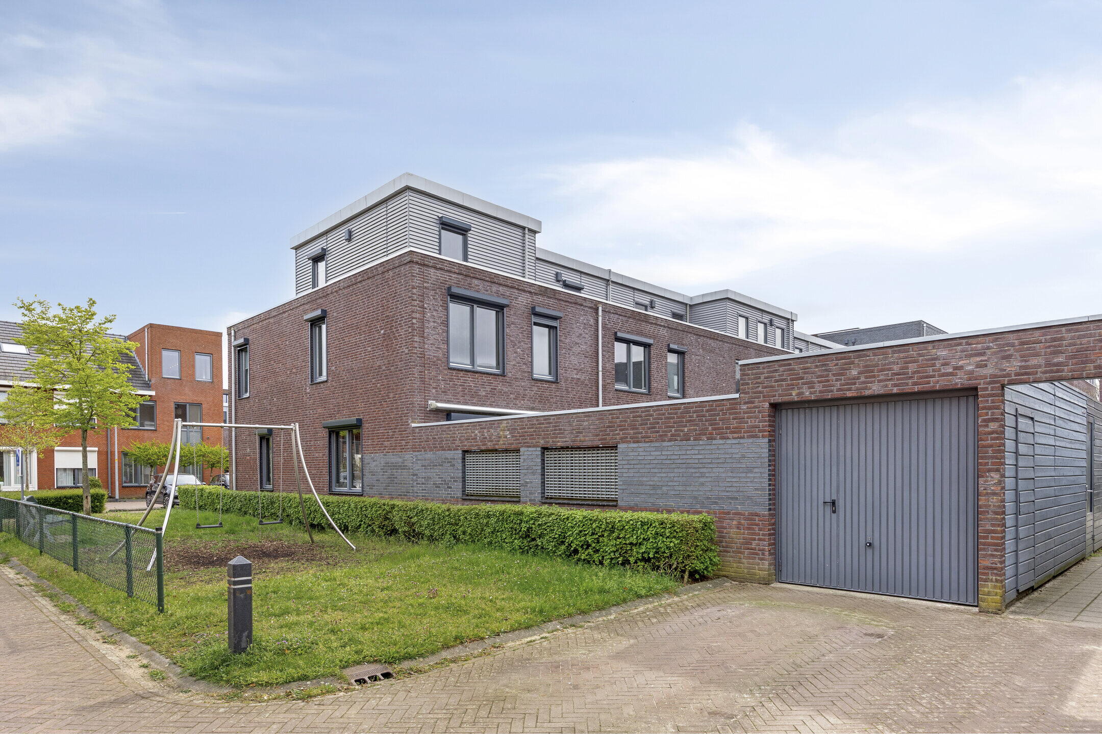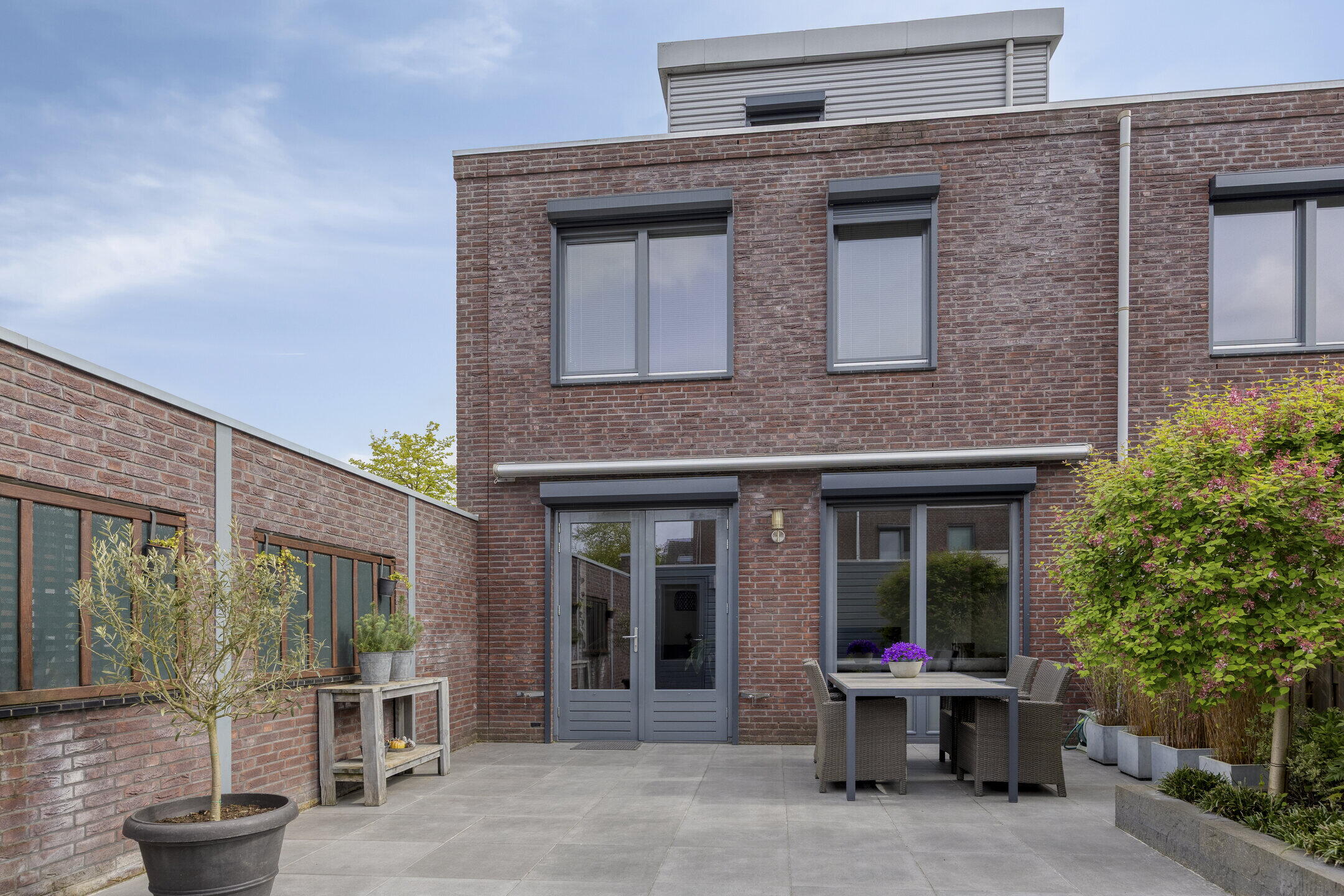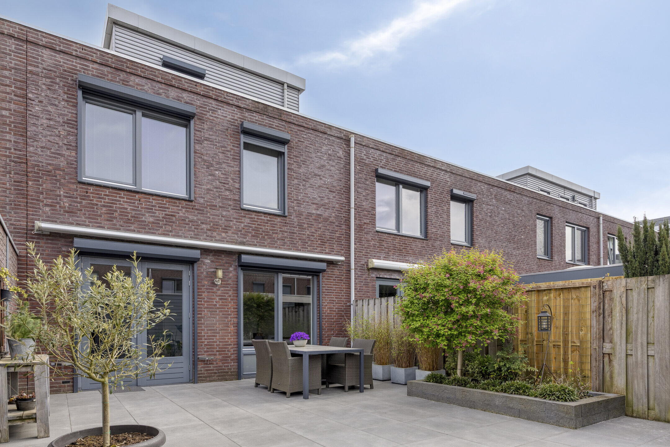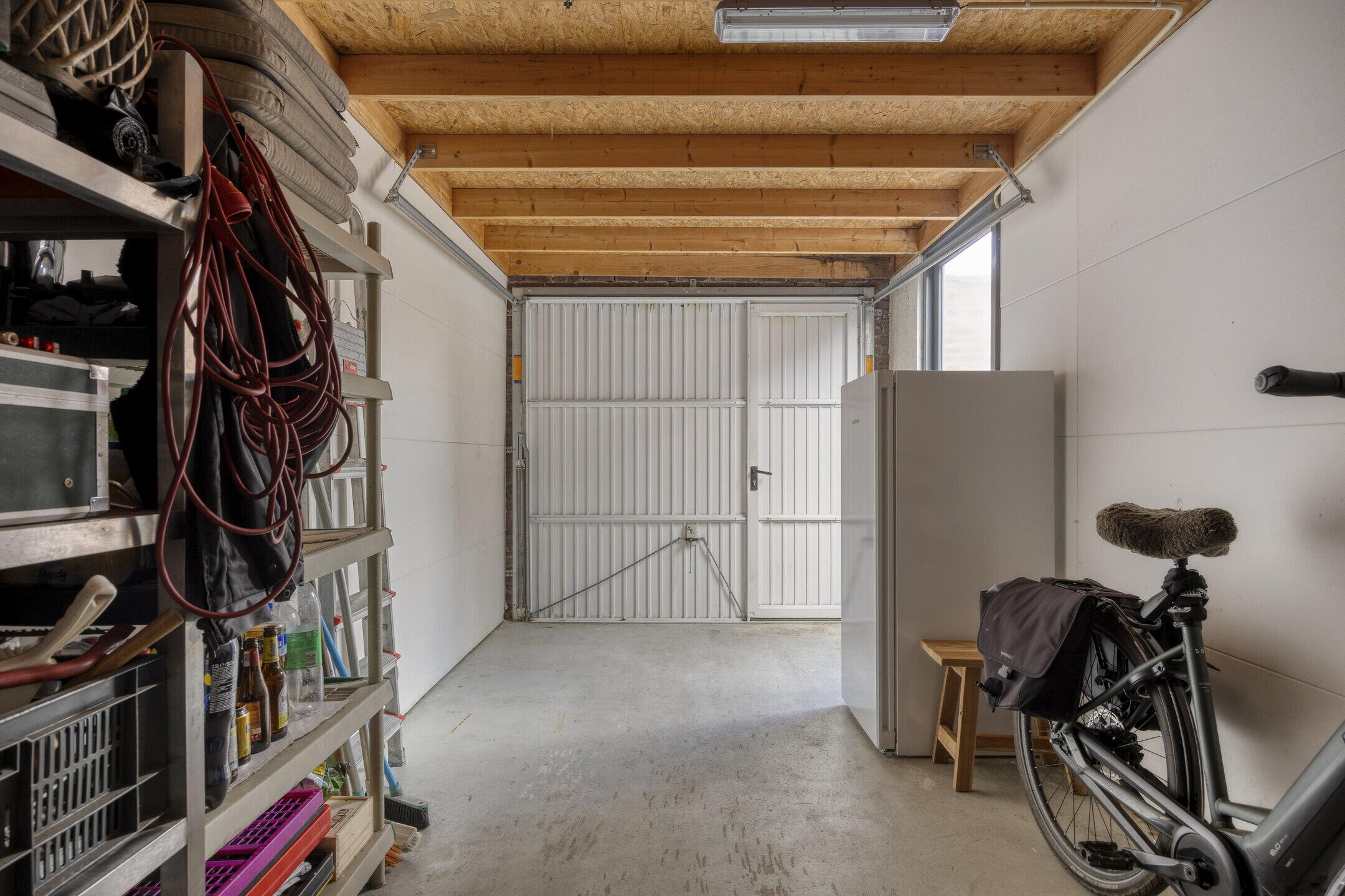 De zonnige achtertuin op het zuidwesten is onderhoudsvriendelijk aangelegd en voorzien van een elektrisch zonnescherm over de volledige breedte. Via de tuin bereik je de vrijstaande, geïsoleerde garage met keukenblok en loopdeur — ideaal voor hobby, werk of opslag.